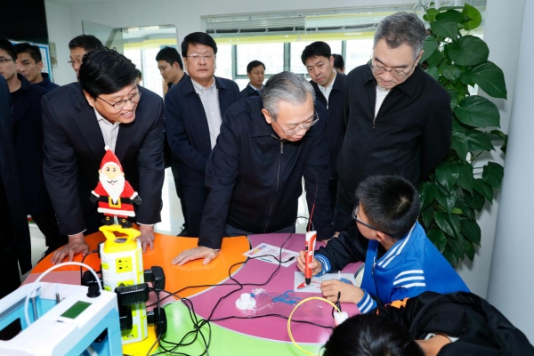 2018年11月,山東省委書記劉家義,赴中印硅谷-創(chuàng)客研學基地與參加研學活動的孩子們進行交流,了解活動的開展情況。 |