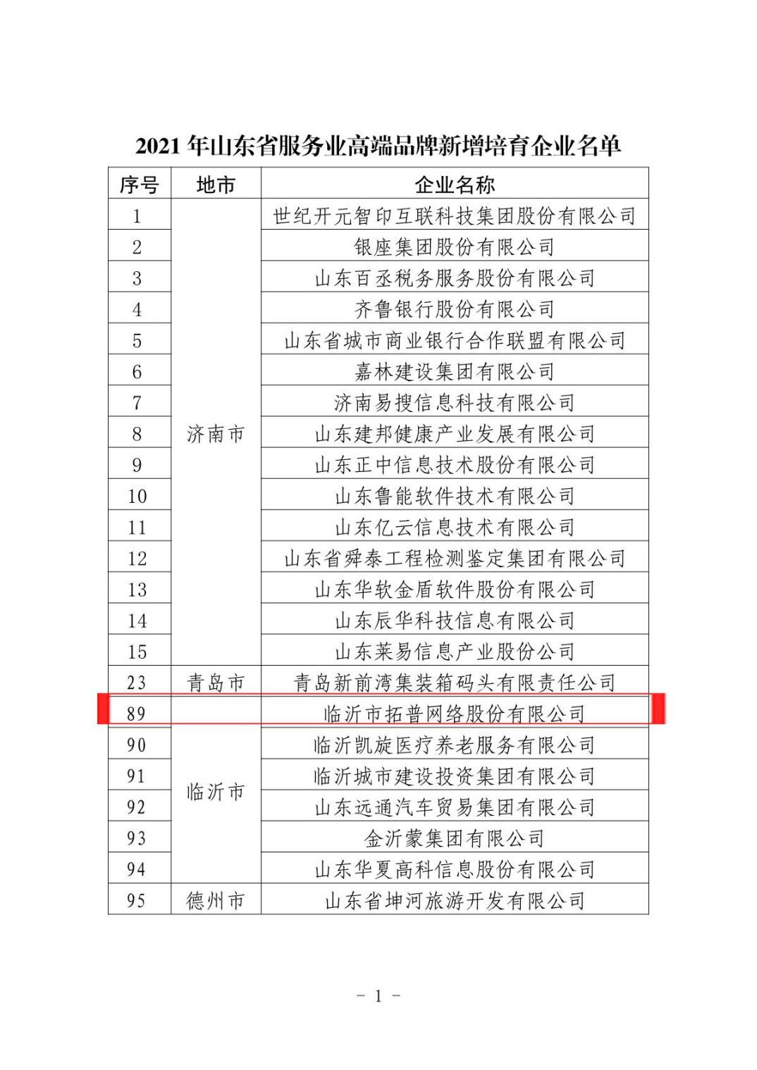 2021年度山東省高端品牌新增培育企業(yè)名單》,臨沂市拓普網(wǎng)絡股份有限公司入選。