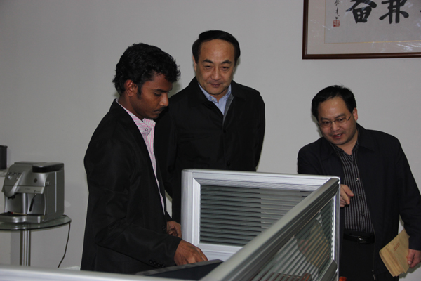 叢局長(zhǎng)與印度專家一一握手 叢局長(zhǎng)與公司王總親切交流 參觀研發(fā)中心