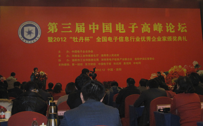12月15日,由中國電子企業(yè)協(xié)會主辦的第三屆中國電子高峰論壇暨2012“牡丹杯”全國電子信息行業(yè)優(yōu)秀企業(yè)家頒獎典禮在河南洛陽舉行,公司總經(jīng)理王嵐保先生榮獲“全國電子信息行業(yè)優(yōu)秀企業(yè)家”稱號。該項榮譽是繼2011年榮獲全國電子信息行業(yè)最具潛力企業(yè)后,公司取得的又一殊榮。 |