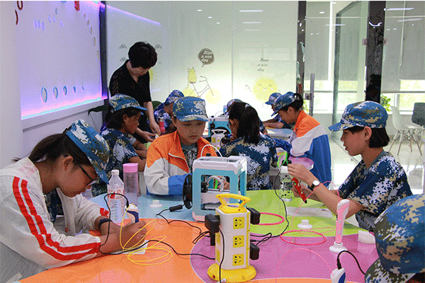 為什么設計的是平面圖形3D打印機卻可以使之立體化?為什么一塊塊不起眼的零件最終能拼插成一個能夠自主行動的機器人?為什么看似簡單易學的空竹抖起來會這么精彩?為什么簡單的電路知識也可以操縱這么復雜的構造?在山東智慧教育創(chuàng)客活動中心綜合實踐區(qū),同學們帶著這些疑問,選修了園區(qū)今年夏天最新引進的28間創(chuàng)客教室上百項研學課程中的幾項精品課程。對于這些初中新生而言,基地各項精彩紛呈的創(chuàng)客課程為他們打開了新世界的大門,激發(fā)了他們對即將面臨的中學生活的好奇心與信心,使他們能夠帶著疑問,在課程學習中去探索發(fā)現,最終在創(chuàng)客課程中找到了答案,更提高了自身的探究能力。