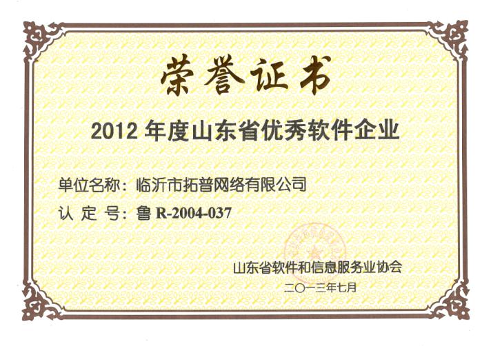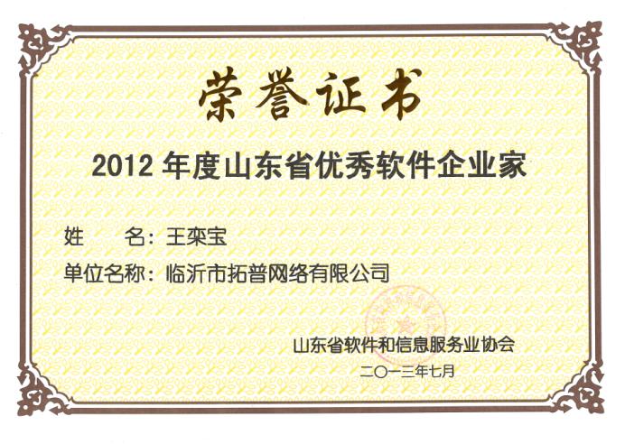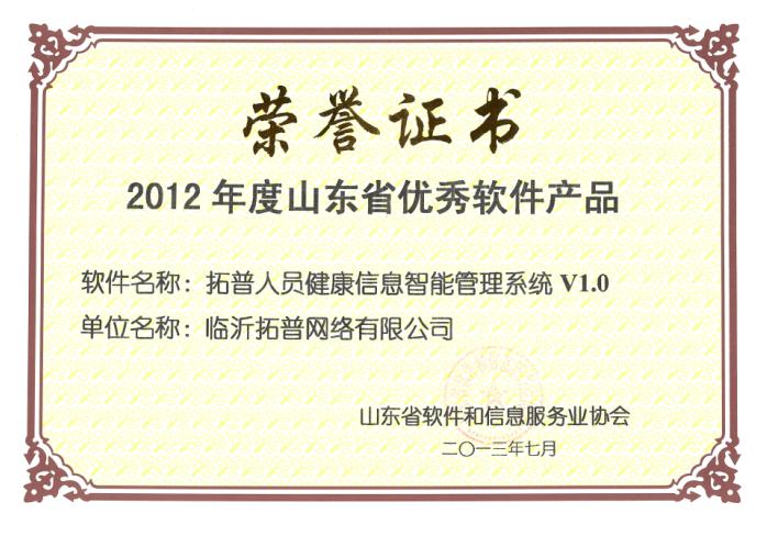 最近,公司喜報(bào)頻傳,山東省軟件和信息服務(wù)業(yè)協(xié)會授予公司三項(xiàng)榮譽(yù):拓普網(wǎng)絡(luò)公司榮獲 “2012年度山東省優(yōu)秀軟件企業(yè)”,公司總經(jīng)理王嵐保榮獲 “2012年度山東省優(yōu)秀軟件企業(yè)家”,“拓普人員健康信息智能管理系統(tǒng)V1.0”榮獲 “2012年度山東省優(yōu)秀軟件企業(yè)產(chǎn)品”。