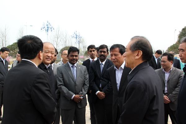 高新亭主任(右二)視察中印軟件產(chǎn)業(yè)園 高新亭、張少軍、徐福田等領(lǐng)導(dǎo)與印度專家親切交談