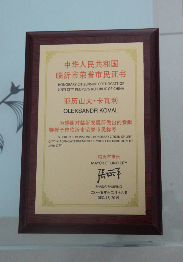 祝賀公司烏克蘭亞歷山大·卡瓦利博士榮獲“臨沂市榮譽市民”稱號 |