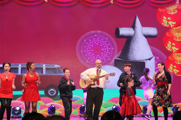 公司外籍專家卡帕娜、愛麗絲和臨沂外國語學校表演《十三五之歌》