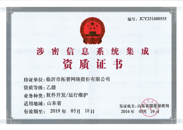 近日,根據(jù)《涉密信息系統(tǒng)集成資質(zhì)管理辦法》(國保發(fā)〔2013〕7號)要求,經(jīng)山東省涉密信息系統(tǒng)集成資質(zhì)審查審批,正式宣布公司通過涉密信息系統(tǒng)集成資質(zhì)認證。