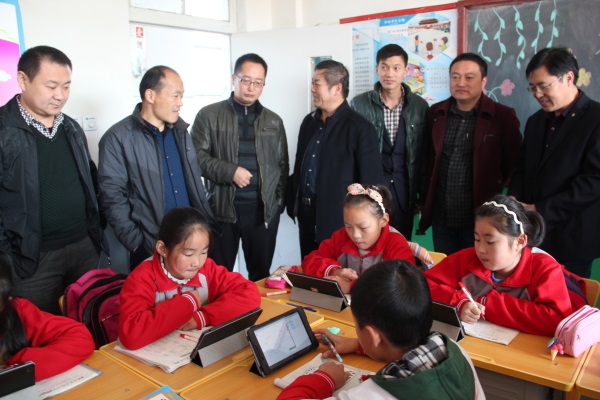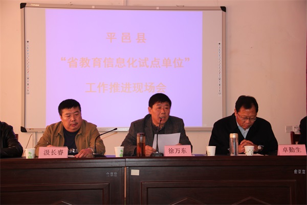 參觀“拓普數(shù)字化教學(xué)班” 隨后,召開平邑縣“省教育信息化應(yīng)用試點(diǎn)單位”工作推進(jìn)現(xiàn)場(chǎng)會(huì),首先通過(guò)視頻轉(zhuǎn)播形式,觀看豐陽(yáng)鎮(zhèn)各學(xué)校共上一堂課——教育信息化應(yīng)用示范課。緊接著,豐陽(yáng)鎮(zhèn)中心校教師職工分別進(jìn)行信息化教學(xué)匯報(bào):豐陽(yáng)鎮(zhèn)中心校姜維娜老師匯報(bào)智慧教育云平臺(tái)“網(wǎng)絡(luò)備課”應(yīng)用情況,廉麗玲老師匯報(bào)學(xué)校網(wǎng)絡(luò)教研開展情況,苑玉華副校長(zhǎng)作“以試點(diǎn)為契機(jī),推動(dòng)教育信息化工作順利開展”的專題報(bào)告。 徐萬(wàn)東在講話中提到,要把教育信息化工作重心從“建”轉(zhuǎn)移到“用”,要“邊建邊用”,在“用”字上下功夫,將教育信息化工作成果融入到教育教學(xué)。教育信息化沒(méi)有捷徑,全市各級(jí)學(xué)校教師要把握“互聯(lián)網(wǎng)+教育”的契機(jī),利用信息化手段實(shí)現(xiàn)教育工作的“公平、質(zhì)量、個(gè)性”發(fā)展。